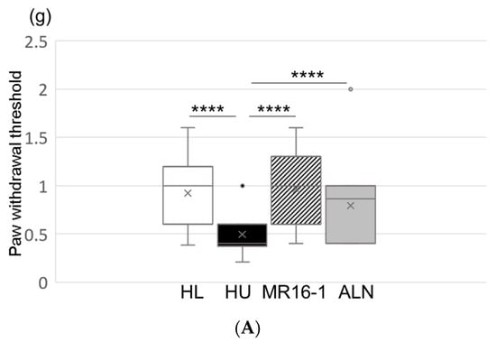 These results suggest that pain-related behaviors were significantly worse in the HU group than in the HL group, and they were significantly improved in the HU-IL-6i and HU-ALN groups than in the HU group. IL-6 receptor inhibitor and ALN improved mechanical hyperalgesia in hindlimbs induced by unloading.