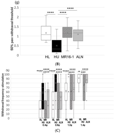 At 2 weeks after reloading, the paw withdrawal threshold and the 50% paw withdrawal threshold remained significantly lower in the HU group than in the HL group (Figure 1A,B). The HU-IL-6i (HU mice treated with anti-IL-6 receptor antibody) and the HU-ALN (HU mice treated with alendronate) groups significantly improved the paw withdrawal threshold and the 50% paw withdrawal threshold compared with HU group (Figure 1A,B). The paw withdrawal frequency stimulations of 0.4-g, 0.6-g, 1.0-g, and 1.4-g filaments were significantly higher in the HU group than in the HL group, whereas they were lower in the HU-IL-6i and HU-ALN groups than in the HU group (Figure 1C).