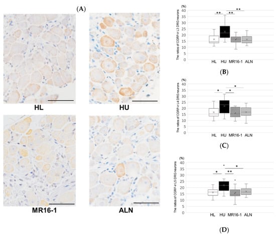 In the immunohistochemical analysis, the percentage of CGRP-immunoreactive L3, L4, and L5 DRG neurons was significantly increased in the HU group compared with the HL group. It was significantly decreased in the HU-IL-6i and HU-ALN groups compared with the HU group (Figure 2A–D).