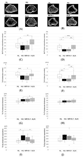 At 2 weeks after reloading, the three-dimensional images of the distal femoral metaphysis (Figure 3A) and proximal tibial metaphysis (Figure 3B) showed less cancellous bone in the HU group than in the HL group. Decreased cancellous bone was improved in the HU-ALN group than in the HU group but not in the HU-IL-6i group.