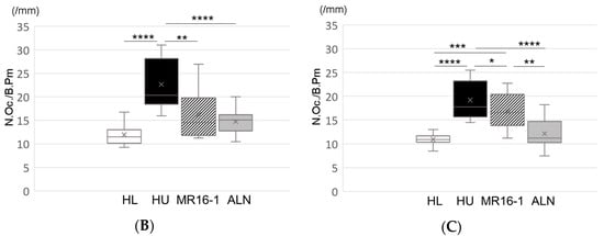 Histological analysis of hindlimb bone: Tartrate-resistant acid phosphatase (TRAP) staining of the proximal tibial metaphysis, Scale bar is 100 μm (A). Histological analysis of the number of osteoclasts/bone perimeter (N.Oc./B.Pm) in the distal femoral metaphysis (B) and the proximal tibial metaphysis (C) (/mm). Top, bottom, and middle lines of the graph correspond to the 75th percentile, 25th percentile, and median, respectively. Cross represents mean. Each circle represents an outlier (n = 8 in each group). * p < 0.05, ** p < 0.01, *** p < 0.005, and **** p < 0.001.