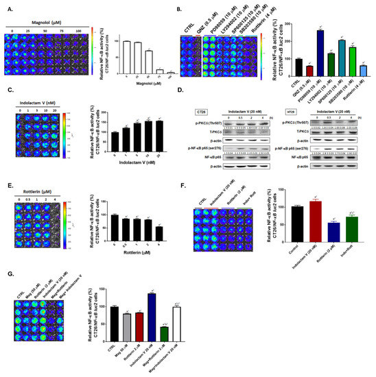 CT26/NF-κB-luc2 cells (5000 cells/well) were seeded in a 96-well plate overnight, followed with 0–100 μM magnolol, 0–20 nM Indolactam V, 0–4 μM Rottlerin, or a combination treatment for 24 h. After treatment, 500 μM D-luciferin was added to 100 μL PBS 5 min before an IVIS 200 system 1 min scan. The NF-κB activity in CT26/NF-κB-luc2 cells were then measured and quantified by IVIS 200 Imaging System and Living Image software (Version 2.20, Xenogen, Alameda, CA, USA), respectively, at unit photons/s/cm2/sr. Additionally, the relative intensity of NF-κB was also normalized by cell viability [48].
