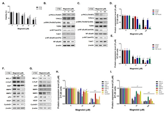 In Figure 2A, we identified the toxicity effect of magnolol in CT26 and HT29 cells. The IC50 of magnolol in CT26 and HT29 cells was around 75 μM at 24 h. Next, we identified whether the phosphorylation of PKCδ, ERK, AKT, and NF-κB was altered by magnolol in CRC cells. In both CT26 and HT29 CRC cells, magnolol can effectively dephosphorylate PKCδ, ERK, AKT and NF-κB molecules (Figure 2B,C). Western blotting quantification results also illustrated the phosphorylation of these molecules was markedly decreased by magnolol by dose depend manner (Figure 2D,E). Furthermore, we identified the alteration of NF-κB downstream proteins expression after magnolol treatment. As showed in Figure 2F–I, expression of NF-κB downstream proteins including MCL-1, C-FLIP, XIAP, MMP-2, MMP-9, VEGF, uPA, and CyclinD1 were all significantly reduced by magnolol [26,27,28,29]. Taken together, magnolol induced the inhibition of CRC cells proliferation, the suppression of PKC-δ/NF-κB signaling, and decreasing of NF-κB downstream protein expression.
