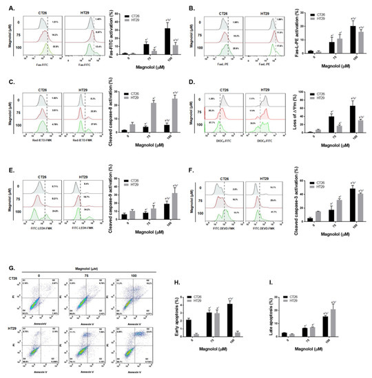 We further evaluated the regulatory mechanism of magnolol on apoptosis in CRC cells. Fas/Fas-L, the death receptor and its ligand, mediated apoptosis were both activated by magnolol treatment in CT26 and HT29 cells (Figure 3A,B). In Figure 3C, cleaved caspase-8 was increased by magnolol. Moreover, magnolol also increased the loss of ΔΨm and the activated caspase-9 (Figure 3D,E). Subsequently, caspase-3 was activated 20–40% by the magnolol treatment group. Annexin-V and PI double positive population, defined as late apoptosis and necroptosis (Figure 3G,I), was also effectively induced by magnolol. In the context of the above results, we suggested that magnolol may trigger both death receptor and mitochondria dependent apoptosis mechanism in CRC cells.