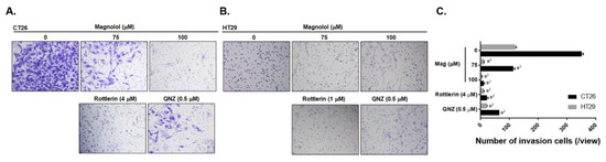 Transwell chambers purchased from BD Biosciences (Franklin Lakes, NJ, USA) were coated with 50 μL matrigel one day before invasion assay. CT26 and HT29 cells were seeded in 10-cm plates (3 × 106 cells/well) overnight and treated with 0, 75, or 100 μM magnolol, 4 μM Rottlerin or 0.5 μM QNZ for 24 h. After treatment, cell viability was rapidly determined with trypan blue, before 2 × 105 viable cells were re-suspended in 300 μL serum-free medium and added to the upper chamber. The lower chamber was filled with 700 μL RPMI-1640 medium containing 10% FBS. After 48 h of migration, cells that invaded transwell membranes were fixed by 4% formaldehyde, stained by 0.5% crystal violet, photographed by microscope (Nikon ECLIPSE Ti-U, Minato City, Tokyo, Japan), and quantified by ImageJ software version 1.50 (National Institutes of Health, Bethesda, MD, USA) [49].