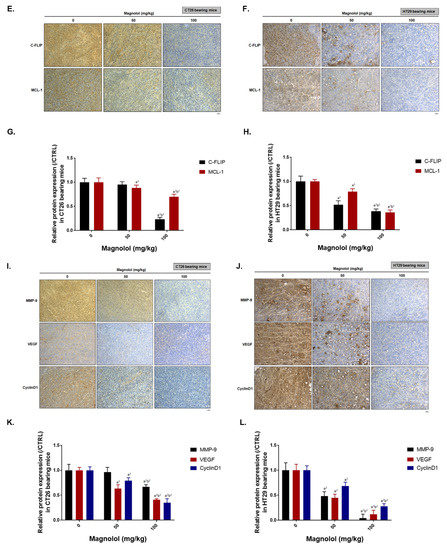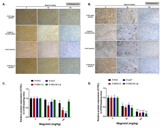 In brief, slices were dehydrated with serial decreasing percentage of ethanol and further procedure was followed by manufacturer IHC staining instructions (EMD Millipore, Burlington, MA, USA). Tumor tissue slices were stained by various primary antibodies, including P-PKC delta, P-ERK, P-AKT, P-NF-Κb p65, MMP-9, VEGF, CyclinD1, C-FLIP, MCL-1, cleaved-caspase-3, cleaved-caspase-8, and cleaved-caspase-9. Slides were imaged using a Nikon ECLIPSE Ti-U microscope under 100× magnification. Positive staining signals were finally quantified by ImageJ software [52]. All the protein expression levels were normalized by actin or phospho-protein/total-protein before comparing with the 0 mg/kg magnolol group.