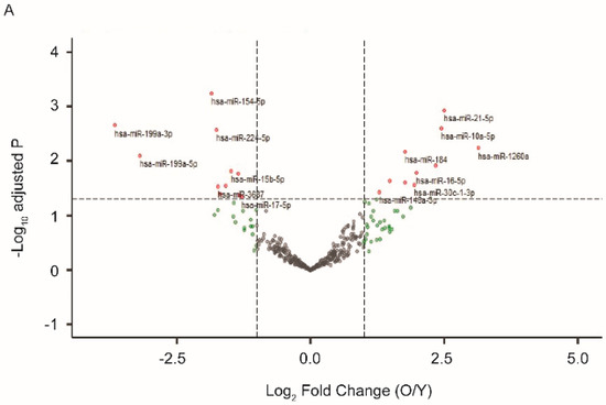 We previously established a model of in vitro postmitotic aging using cultured human RPE cells [30]. In media with a defined nutrient composition, confluent RPE cells gradually developed a battery of aging markers and displayed functional loss after four to six weeks in culture [30]. At one and four weeks after the beginning of the postmitotic aging, we isolated EVs that had been released from the cultured RPE cells and compared their miRNA profiles. As shown in Figure 1A, among the 340 miRNA species detected in EVs from RPE, 66 had at least 2-fold up- or down-regulation. Eleven of them, including miR-184, 10a, and 21, were significantly upregulated (Benjamini–Hochberg adjusted p-value < 0.05). Eleven of them, including miR-154, 199a, and 224, were downregulated (adjusted p-value < 0.05) in EVs from aged RPE.