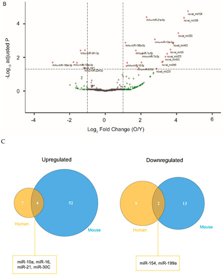 Differential expression of miRNAs in extracellular vesicles (EVs) from young and old retinal pigment epithelium (RPE). EVs were isolated from either cultured human RPE cells (A) or mouse RPE/choroid-conditioned medium (B). EV-associated RNA was extracted and sequenced. Differential gene expression data were presented as volcano plots to show the fold of change (x-axis) and adjusted p value (y-axis). The horizontal dashed line indicates an adjusted p-value < 0.05 threshold, and vertical dashed lines indicate a fold change > 2 threshold. MiRNA species showing significant changes in EVs derived from aged RPE were marked with red and annotated on the plots. (C) Venn diagrams illustrating the number of exosomal miRNAs with significantly altered expression between young and aged samples from human or mouse RPEs. Mature sequences of the miRNA species at the intersections are conserved between mouse and human.