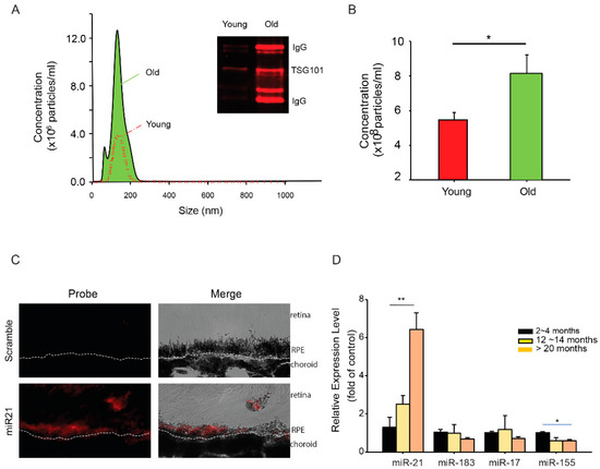 To obtain further understanding of the differences of miRNAs in the EVs derived from young and old RPE, we analyzed the size and abundance of EVs released from posterior eyecups using nanoparticle tracking analyses. The size distributions were comparable between EVs from young and aged RPE (Figure 2A). Aged RPE/choroid tissue had about a 2-fold increase (2.2 ± 0.4, mean ± SD) in the amount of EVs released into the medium (Figure 2B). EVs isolated from the eyecups had exosomal marker proteins such as TSG101 (Figure 2A inset), validating the presence of exosomes in our preparation [31]. EVs from aged RPE tissues consistently showed the presence of immunoglobulin (IgG) heavy and light chains (Figure 2A). Similar findings have been recently reported from EVs isolated from diabetic plasma samples [32].