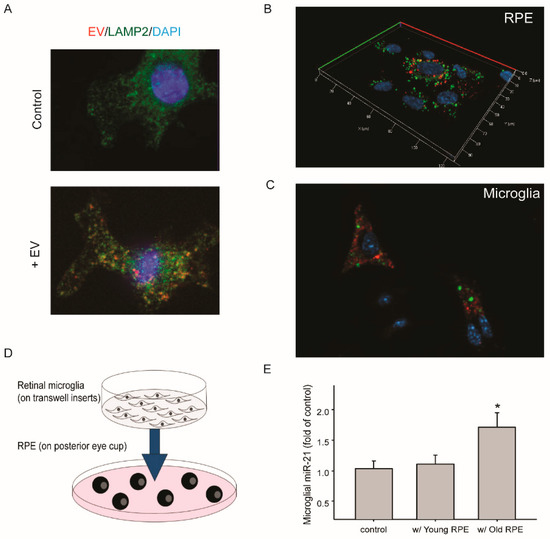 With aging, retinal microglia migrate from the inner layer to the sub-retinal space [35,36]. Its proximity to the RPE may promote the uptake of EVs released by aged RPE. To test this hypothesis, we examined the transfer of EVs and their miRNAs between RPE and retinal microglia. When cultured microglia were treated with RPE-derived EVs, the uptake and intracellular presence of EVs were detected after 30 min (Figure 3A), and some of the EVs showed co-localization with lysosome marker protein LAMP2. Two methods were utilized to measure the transfer of miR-21 between RPE and retinal microglia (Figure 3B,C). First, fluorescein-conjugated miRNA-21 was transfected into cultured mouse RPE cells (Figure 3B). One day after transfection, RPE-conditioned medium was used to treat microglia that had been grown on coverslips. After two hours, the transfer of miR-21 was detected by fluorescence microscopy (Figure 3C). In the second approach, retinal microglia grown on transwell inserts were co-cultured with eyecups prepared from mice at different ages (Figure 3D). The basal level of miR-21 in microglia was low. Co-culture with RPE/choroid tissues from aged mice (18 to 22 months), but not that from young mice (4 to 6 months), upregulated miR-21 in microglia (Figure 3E).