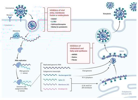 Inhibitors of virus cell entry and endocytosis as well as inhibitors of certain cellular pathways involved in the viral cycle constitute an important reservoir of antiviral drugs, such as methyl-β-cyclodextrin (MβCD), which works by depleting cholesterol [83]. In vitro cell models expressing ACE2 showed that cholesterol depletion by MβCD dramatically decreased the number of bonds with the S protein and reduced ACE2 expression in a dose-dependent manner leading to reduced SARS-CoV replication [84]. Similarly, phytosterols, which are lipophilic molecules that can interact with the lipid raft and reduce membrane cholesterol and destabilize the membrane structure, impact viral infectivity significantly. Other direct inhibitors of the endocytosis process, such as chlorpromazine, chloroquine, and umifenovir (Arbidol), have also shown promising results [48,85,86].