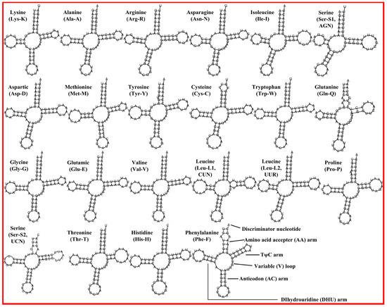 - Lowe, T.M.; Eddy, S.R. TRNAscan-SE: a program for improved detection of transfer RNA genes in genomic sequence. Nucleic Acids Res. 1997, 25, 955–964. [Google Scholar] [CrossRef]