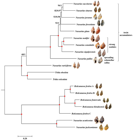 In Asia, nassariids are consumed as seafood [7,14]. However, due to their ability to accumulate toxins (e.g., algal toxin or tetrodotoxin) [15,16], several poisoning incidents caused by the consumption of certain nassariids have been reported occasionally in some Asian countries [17,18,19]. Recent studies found that the toxicity varied in species [20,21]. For example, most marine nassariids are toxin accumulators in addition to Nassarius variciferus and Reticunassa festiva which could not accumulate toxins. Among those toxin accumulators, N. siquijorensis and N. glans are widely distributed in the subtidal regions of the Indo-Pacific Ocean. The ecology and toxicology of N. siquijorensis and N. glans have been the subjects of numerous studies [20,22]. In spite of the biological significance, the classification and phylogenetic positions of N. siquijorensis and N. glans within Nassarius are still controversial. For example, the sister group of N. siquijorensis and N. nodifer revealed by Chen and Zhang [8] was not recovered by Pu et al. [23], although both studies were poorly supported.