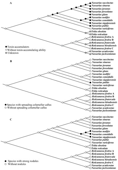 In the present phylogeny (Figure 4), N. variciferus was the first species branching off. The distant phylogenetic relationship between N. variciferus and other nassariids has also been revealed in previous studies [6,7]. Based on the morphology of shell characteristic, N. variciferus was previously classified into subgenus Varicinassa, which was defined as a single-species group with prominent angulate varices on whorls [5]. However, the presence of varices appears to be a morphological phenotype because individuals of N. variciferus without varices have also been found [7]. According to previous records, almost all Nassarius species were toxin accumulators except for N. variciferus (Table 1). It is inferred that nassariid toxins, which were recognised as algal toxin or tetrodotoxin, could not be produced by nassariids themselves, but might be from the environment (probably via the food chains [47]). Therefore, the differences on toxicity may reflect different food preferences. However, further studies concerning the components and sources of nassariid toxins as well as the anatomical characteristics of nassariid digestive systems are needed to support the present hypothesis.