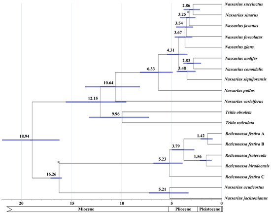 Divergences time estimations for the Nassariidae using Bayesian relaxed dating methods (BEAST) based on the nucleotide sequences of 13 PCGs: Dates (and credibility intervals) are in millions of years, and horizontal bars represent 95% credibility intervals of relevant nodes. Calibration constraints are indicated with an asterisk on the corresponding nodes.