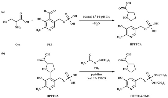 Piechocka, J.; Wrońska, M.; Głowacka, I.E.; Głowacki, R. 2-(3-Hydroxy-5-phosphonooxymethyl-2-methyl-4-pyridyl)-1,3-thiazolidine-4-carboxylic Acid, Novel Metabolite of Pyridoxal 5′-Phosphate and Cysteine Is Present in Human Plasma—Chromatographic Investigations. Int. J. Mol. Sci. 2020, 21, 3548. https://doi.org/10.3390/ijms21103548