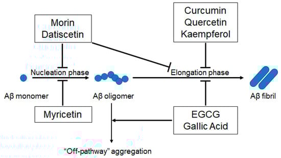 Quercetin, a readily available naturally occurring polyphenol, is found abundantly in vegetables and fruits, such as onions and apples [87]. Quercetin is well known to have antioxidant and anti-inflammatory properties, and is expected to play protective roles in a wide range of diseases [88,89,90]. In vitro aggregation studies show that quercetin inhibits Aβ fibril formation by strengthening the hydrophobic interactions between the Aβ β-sheet structure and the aromatic ring by hydrogen bonding [91]. Quercetin exerts an anti-amyloidogenic effect in vitro by preferentially binding to Aβ fibrils at the growth edge, rather than to Aβ monomers, resulting in inhibition of fibril elongation [11]. Quercetin also reduces Aβ-induced neurotoxicity in a cell system overexpressing mutant APP, which is associated with early-onset familial AD [91]. Treatment with quercetin reduced the number and size of Aβ plaques and improves cognitive function in an AD mouse model [92]. Kaempferol, an analog of quercetin, also showed anti-Aβ aggregation activity [66]