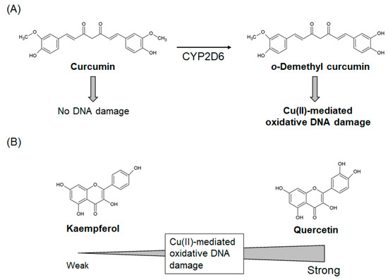 Curcumin has also been reported to have pro-oxidant properties under some conditions [85]. Several studies have reported ROS generation and DNA damage in cultured cells exposed to curcumin [39,40,41]. A National Toxicology Program study has revealed that the dietary intake of turmeric oleoresin, which contains a high curcumin content (79–85%), induced hyperplasia of the colon mucosa in rats and increased hepatocellular adenoma in mice [43]. These findings raise the possibility that curcumin-induced oxidative DNA damage may promote tumorigenesis [78]. However, we have previously shown that curcumin does not cause damage to isolated DNA by itself, even in the presence of Cu(II) [42]. Curcumin/Cu(II)-mediated oxidative DNA damage has occurred only when curcumin was pre-treated with cytochrome P450 (CYP) enzymes, suggesting that metabolites of curcumin act as DNA-damaging agents [42]. Mass spectral analysis indicated CYP2D6-mediated o-demethyl curcumin formation, which was considered to generate Cu(I)-hydroperoxide during the autoxidation of o-demethyl curcumin, resulting in DNA damage [42]. CYP enzymes are known to be related to bioactivation of several chemical carcinogens [86], suggesting that curcumin-mediated hepatocellular adenoma in mice [43] might be explained by particular metabolisms of hepatocytes. o-demethyl curcumin has a catechol moiety (phenol with two hydroxy groups in the ortho-position), resulting from CYP-mediated demethylation of curcumin, that is likely to play a critical role in oxidative damage (Figure 4A). Thus, some antioxidants could be converted to pro-oxidants in particular metabolic conditions. These findings suggest that it is important to evaluate not only target polyphenols but also their metabolites.