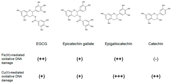 Fe(III)- and Cu(II)-mediated DNA damage caused by green tea polyphenols. Three tea polyphenols with pyrogallol moieties (EGCG, epicatechin gallate, and epigallocatechin) can induce Fe(III)- and Cu(II)-mediated oxidative DNA damage although, catechins, which harbor no pyrogallol moieties, only cause Cu(II)-mediated oxidative DNA damage. (+++), (++), (+), and (-) represent the extent of DNA damage. EGCG: epigallocatechin gallate