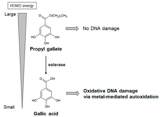 In contrast, potential harmful effects of propyl gallate and gallic acid, associated with their pro-oxidant properties, have also been reported [59,60,61,62,63]. Propyl gallate, but not gallic acid, is carcinogenic in mice and rats [123]. While propyl gallate led to 8-oxodG formation in cultured cells, it did not induce damage in isolated DNA [60]. Propyl gallate has been known to convert to gallic acid by an esterase (Figure 6) [124]. Therefore, to clarify its mechanism of carcinogenicity, we studied isolated DNA damage caused by gallic acid. Gallic acid and esterase-treated propyl gallate could induce Fe(III)- and Cu(II)-dependent oxidative DNA damage in isolated DNA through metal-mediated autoxidation [60]. These results suggest that gallic acid converted from propyl gallate plays an important role in propyl gallate-mediated carcinogenicity. To understand why gallic acid, but not propyl gallate, induces oxidative DNA damage, highest occupied molecular orbital (HOMO) energy estimation [125] was performed. The HOMO energy of the anionic form of gallic acid is smaller than that of propyl gallate, suggesting that gallic acid can readily undergo autoxidation compared to propyl gallate (Figure 6) [60]. Furthermore, gallic acid has been reported to display toxic effects other than carcinogenesis [59,62,63]. Administration of gallic acid induces liver injury [62,63] in mice and rats, and renal damage [63] in rats. ROS-associated cytotoxicity of gallic acid against noncancerous cell has been demonstrated using rat primary cultured hepatocytes [62] and vascular smooth muscle cells [59].