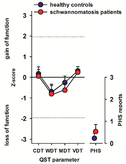 QST profile. CDT: cold detection threshold, WDT: warm detection threshold, MDT: mechanical detection threshold, VDT: vibration detection threshold, PHS: paradoxical heat sensations. Z-scores between −1.96 and +1.96 represent the normal range of healthy subjects. All values are normalized for age, gender and testing site on a Z-scale. Z-scores > 1.96 indicate a gain of sensory function; i.e., the subject detects the stimulus at a lesser stimulus intensity than healthy controls in case of detection thresholds (hyperaesthesia). By contrast, Z-scores < −1.96 indicate a loss of sensory function; i.e., the subject detects the stimulus at a greater stimulus intensity than healthy controls in case of detection thresholds (hypoaesthesia).