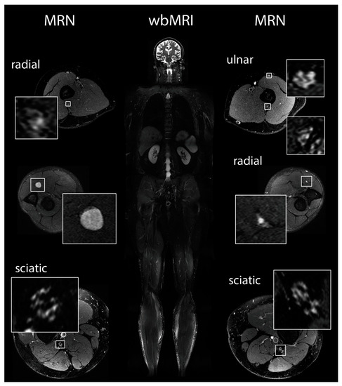 Scheme of imaging strategy. wbMRI and MRN protocols were performed for comprehensive imaging evaluation. wbMRI (middle column) was used for detection of large tumors. MRN (left and right columns) was used for detection of smaller nerve lesions. In this patient, fascicular nerve lesions are present in all nerves, while a larger tumor is shown in the right radial and an intermediate-sized nodule in the left radial nerve.