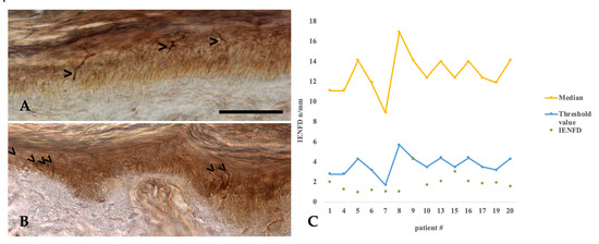 Skin biopsies were performed in 14 of 20 patients by an expert surgeon for plastic surgery (RF). Six patients refused to have skin biopsies. An 8 mm punch biopsy was taken 10 cm above the lateral malleolus of the distal leg according to the standardized protocol for diagnosis of small fiber neuropathies (European Federation of Neurological Societies/Peripheral Nerve Society Guideline) [24]. The tissue was directly transferred into Zamboni solution and cooled to 4 °C. Immunohistochemical staining and evaluation was performed at the Institute of Neuropathology, University Medical Center Hamburg-Eppendorf, by using a standardized protocol. In short, 50 µm thick frozen cross sections of the skin sample were cut on superfrost slides additionally coated with poly-L-lysine (Sigma-Aldrich, #P8920, Taufkirchen, Germany) and air dried for at least 24 hrs. Blocking of endogenous peroxidase was done with 3% perhydrol (Merck, #107209, Darmstadt, Germany) in methanol for 90 min. The tissue was rehydrated and pre-treated for antigen-retrieval in 10 mM citrate buffer pH 6 for 90 min at 80 °C. The samples were then incubated with polyclonal rabbit anti-PGP 9.5 (Dako #Z5116, Glostrup, Denmark, antibody dilution 1:200) over night at room temperature. Bound antibody was visualized with anti-rabbit secondary antibody (Histofine Max PO Multi, #414152 F, Nichirei Biosciences Inc., Tokyo, Japan) for three hours followed by addition of the chromogen Metal Enhanced DAB Substrate Kit (Thermo Scientific, #34065, Bremen, Germany) according to manufacturer’s instructions for 15 min. Counterstaining was performed with haemalum. Antibody labelling of dermal nerve fascicles served as internal positive control and was differentiated from weak unspecific stroke-like staining of collagen fibers and chromogen deposition in small tissue tears and clefts by the higher intensity of labelling, the stretch from subepidermal to intradermal layer and the characteristic curved shape of the fibers with sudden turns and bends (Figure 4A). For estimation of nerve fiber density the intraepidermal nerve fiber count per mm skin was evaluated in at least three cuts corresponding to a skin length of approx. 9 mm by two experienced neuropathologists (MG and CH) who were blinded to patient identity and diagnosis. The intraepidermal nerve fiber density (IENFD) was compared to age-dependent reference values [12]. The raw IEND data were plotted against age, separately for male and female patients and compared to the normative reference IEND. Some parts of this analysis have already been published in a comparative study with patients exhibiting NF2 [13]; that protocol focused on establishing a new diagnostic approach for differential diagnosis and is a follow-up protocol to this study.