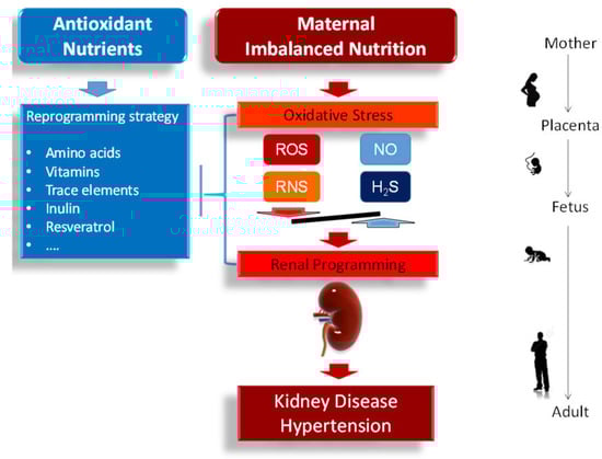 During kidney development, the renal structure and function can be permanently altered in response to a variety of adverse intrauterine environmental factors by so-called renal programming [,]. One of the most characteristic insults is maternal malnutrition [,]. The developing kidney can be programmed by a poor nutritional environment in pregnancy, leading to kidney disease and hypertension in later life [,,]. Likewise, oxidative stress, an imbalance between reactive oxygen species and antioxidant defenses, plays a pathophysiological role in fetal programming [,,]. Emerging evidence demonstrates that early-life oxidative stress can increase the risk of developing kidney disease and hypertension in later life [,]. Conversely, nutritional programming can also be beneficial []. Certain antioxidant nutrients during the period of developmental plasticity can reverse the programming processes to prevent various adult diseases, also known as reprogramming [,]. This review highlights the interplay between nutrition and oxidative stress in pregnancy, causing renal programming, links developmental programming of kidney disease and hypertension. Particular interest is given to the perinatal use of antioxidant nutrients as reprogramming strategies to reverse renal programming and prevent kidney disease and hypertension of developmental origins. The interplay among maternal nutrition, oxidative stress, renal programming, and the risks for developing kidney disease and hypertension in adult offspring is illustrated in Figure 1.