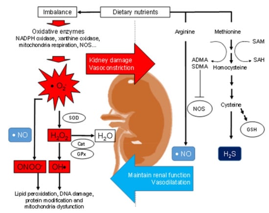 Schematic representation of the interrelationships between reactive oxygen species (ROS, antioxidant defense system, nitric oxide (NO), and hydrogen sulfide (H2S) signaling system in the kidney to control blood pressure and renal function. Imbalanced nutrition can activate reactive oxygen species (ROS) and reactive nitrogen species (RNS), leading to kidney damage and vasoconstriction. Several oxidative enzymes can produce superoxide anion (O2−), such as NADPH oxidase, xanthine oxidase, and mitochondrial respiration. The superoxide anion can interact with nitric oxide (NO) to form peroxynitrite (ONOO−). Hydrogen peroxide (H2O2) and hydroxyl anion (OH−) are reactive byproducts of superoxide. These ROS can be produced via superoxide dismutase (SOD), catalase, or glutathione peroxidase (GPx). On the other hand, dietary nutrients provide L-arginine and L-methionine for the synthesis of NO and H2S, respectively. Both NO and H2S are vasodilators and play a key role in maintaining renal physiology. While L-arginine can also be posttranslational methylation to form asymmetric or symmetric dimethylarginine (ADMA or SDMA), both are endogenous inhibitors of nitric oxide synthase (NOS). There is a relationship between the L-arginine-NO and the H2S-synthesizing pathway. The protein arginine methyltransferases (PRMTs) methylate L-arginine to generate ADMA/SDMA and concurrently demethylate methionine to form homocysteine. S-adenosylmethionine (SAM) is used as a substrate for methyl transfers that yield S-adenosylhomocysteine (SAH). Homocysteine can further be broken down to generate L-cysteine and glutathione.