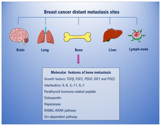 Solid cancers frequently metastasize to bone, as arises in about 70% of lung, prostate, and breast cancers. In patients with BC, the skeleton is the most frequent metastasis site [16]. Bone metastasis is a frequent, wasting, and incurable breast cancer complication [13]. In most cases, we have observed bone metastases in BC patients with large neoplasms already at the moment of diagnosis but also, in some cases, BC patients with small tumors who have bone metastases diagnosed during preoperative staging or even the appearance of bone metastasis in BC patients underwent surgery 15–20 years earlier (personal observations).