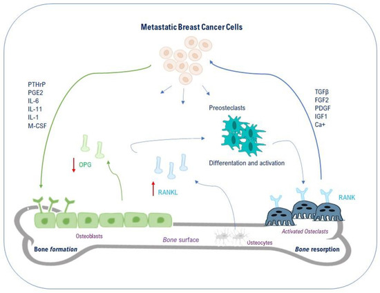 Once in the bone, in fact, BC cells release several factors such as interleukins, osteopontin, parathyroid hormone-related peptide (PTHrP), prostaglandin E2, and heparanase that can induce osteoclasts activation and bone resorption. In particular, PTHrP released by BC cells binds to osteoblasts via its receptor and then induces Receptor-Activator-of-Nuclear-factor-Kappa-B-Ligand (RANKL) up-regulation and Osteoprotegerin (OPG) down-regulation (in physiological conditions OPG acts as a decoy receptor binding the excess of RANKL). RANKL overexpressed by activated osteoblasts binds to its receptor RANK on preosteoclasts. Then, the activation of the RANKL-RANK signaling pathway induces the differentiation of preosteoclasts into activated osteoclasts and leads to bone resorption. Successively, activated osteoclasts degrade bone matrix by releasing proteinases and hydrogen ions to create the acid environment [19,20,21,22]. Furthermore, resorbed bone secretes specific growth factors, such as IGF1, PDGF, TGFβ, and calcium, that enhance tumor proliferation in osseous [18]. Overall, the relationship between bone resorption and tumor growth forms a “vicious cycle” (Figure 2).