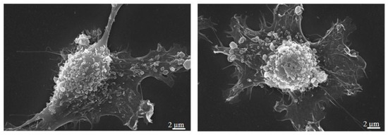 Scanning Electron Microscopy of MDA-MB-231 cells showing EVs release from cell surface. Magnification 10,000×; scale bar 2 µm (personal images).