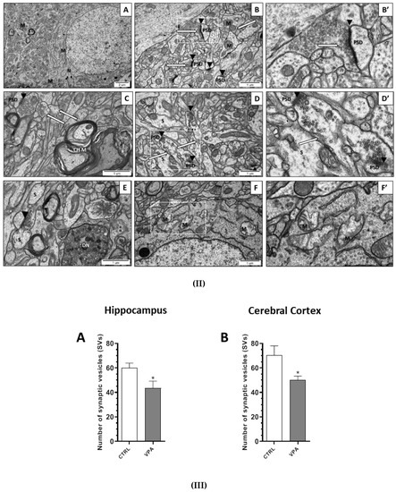 (I). The effect of prenatal exposure to VPA on the ultrastructure of neuronal cells in the CA1 region of the hippocampus of the offspring. (A–B’) Control group. Ultrastructurally unchanged neuronal cells, unaltered structure of neuropil with normal appearance of the synaptic cleft (black arrowheads), well-defined structure of the synapses with accurate postsynaptic density (PSD), the correct distribution of synaptic vesicles (SVs) (long arrows), and ultrastructurally unchanged mitochondria (M). (C–G) VPA-exposed group. Reduced packing density of SVs in the presynaptic area (release of SVs from the presynaptic area accompanied by disruption of the synaptic membranes) (long arrow), nerve ending swelling (S), blurred and thickened structure of the synaptic cleft without clearly marked pre- and postsynaptic membranes (black arrowheads). Ultrastructurally changed mitochondria with a blurred cristae structure (M). Astrocytes with features of swelling (SA) and swollen perivascular astrocyte processes (SPAP) were observed. Microglial cell activation (Mi); (VL) Vascular lumen; (G) Golgi apparatus; (ER) Endoplasmatic reticulum; (N) Neuron. Representative pictures from n = 6 independent experiments for the control and experimental animals are presented. (II). The effect of prenatal exposure to VPA on the ultrastructure of neuronal cells in the cerebral cortex of the offspring. (A–B’) Control group. Ultrastructurally unchanged neuronal cells, unaltered structure of neuropil with normal appearance of the synaptic cleft (black arrowheads), well-defined structure of synapses with accurate postsynaptic density (PSD), correct distribution of SVs (long arrows), and well preserved mitochondria (M). (C–F’) VPA-exposed group. Reduced packing density of SVs in the presynaptic area (release of SVs from the presynaptic area accompanied by the disruption of the synaptic membranes) (long arrows), nerve ending swelling (S), and blurred and thickened structure of the synaptic cleft, without clearly marked pre- and postsynaptic membranes (black arrowheads). Ultrastructurally changed mitochondria with a blurred cristae structure (M). Changed myelin structure (CHM); (DN) Degenerating neuron; (N) Neuron. Representative pictures from n = 6 independent experiments for the control and experimental animals are presented. (III). The effect of prenatal exposure to VPA on the synaptic vesicles (SVs) number. The effect of VPA on the number of synaptic vesicles (SVs) in the CA1 region of the hippocampus (A) and the cerebral cortex (B) was analysed at postnatal day 58 (PND58). The number of SVs was counted in 30 nerve endings of each animal from the control and experimental groups. Data represent the mean values ± SEM from n = 4 independent experiments. * p ˂ 0.05, vs. control.