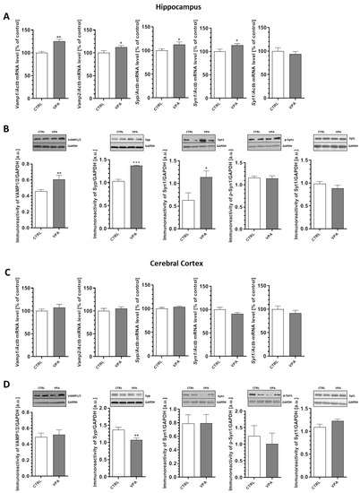 The changes in synaptic ultrastructure observed in the prenatally treated VPA rats encouraged us to investigate the possible effects of this compound at the molecular level. To evaluate if the morphological alterations of the synapses in the VPA offspring may be related to changes in the synaptic proteins, a quantitative analysis of the level of mRNA and a semi-quantitative analysis of the level of key presynaptic proteins were performed. We examined the expression of synaptic vesicle proteins (v-SNARE): synaptobrevin 1 and 2 (VAMP1/2), synaptophysin (Syp), synapsin 1 (Syn1), phospho-synapsin 1(Ser62/Ser67) (p-Syn1), and Ca2+-sensing synaptotagmin 1 (Syt1) together with the proteins associated with the presynaptic plasma membrane (t-SNARE): SNAP25 and syntaxin 1 (Stx1). Our data indicated a significant increase in both the gene expression and protein level of VAMP1/2 (an increase in Vamp1 and Vamp2 expression by about 25% (p = 0.0016) and 12% (p = 0.0290), respectively, together with a significant increase by 32% for the VAMP1/2 protein level (p = 0.0062)) in the hippocampus of the VPA offspring (Figure 3A,B). In addition, in the same brain structure we observed a significant (p < 0.001) increase of about 32% in the level of Syp with a concomitant rise by about 12% in the mRNA level (p = 0.0488) compared to the control group (Figure 3A,B). Moreover, exposure to VPA during foetal life induced elevation in both the Syn1 gene expression (by about 14%, p = 0.0365) and the protein level of synapsin 1 (by about 80%, p = 0.0278) in the hippocampus (Figure 3A,B). The quantitative RT-PCR and Western blot analysis revealed a lack of changes in both mRNA and the protein level of p-Syn1 and Syt1 in the hippocampus of VPA-exposed animals (Figure 3A,B). On the other hand, in the cerebral cortex of VPA rats, we observed a significant (p = 0.0098) decrease by about 21% in the level of Syp without changes in the gene expression of this protein (Figure 3C,D). Moreover, prenatal exposure to VPA had no effect on the expression of VAMP1/2, Syn1, p-Syn1, and Syt1 in this brain structure (Figure 3C,D).
