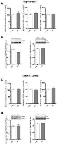 In turn, our analysis of expression of the presynaptic plasma membrane proteins revealed a significant (p = 0.0024) decrease of about 20% in the protein level of SNAP25 in the hippocampus of the VPA offspring despite the 15% increase (p = 0.0086) in Snap25 gene expression (Figure 4A,B). Prenatal exposure to VPA had no effect on the expression of this protein in the cerebral cortex (Figure 4C,D). In addition, the quantitative RT-PCR and Western blot analysis revealed a lack of changes in Stx1a and Stx1b mRNA expression, as well as the protein level of Stx1 in both examined brain structures of the young-adult offspring prenatally exposed to VPA (Figure 4A–D).