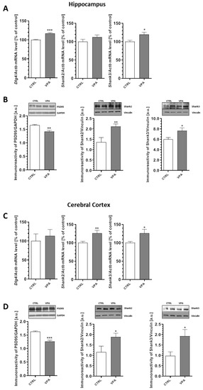 In the next step, we examined the expression of the crucial postsynaptic scaffolding proteins that are essential for efficient neurotransmission, synaptogenesis, and neurodevelopment: postsynaptic density protein 95 (PSD95) and the SH3 domain and ankyrin repeat-containing protein (Shank). The effect of prenatal exposure to VPA on the expression and protein level of PSD95, Shank2, and Shank3 in the hippocampus and cerebral cortex are summarized in Figure 5. Our data indicated that exposure to VPA during embryonic development significantly reduced the level of PSD95 by about 14% in the hippocampus (p = 0.0024) and by about 22% in the cerebral cortex (p = 0.0003) (Figure 5B,D). A decreased level of PSD95 in the hippocampus was accompanied by an increase of its gene expression by about 17% (p = 0.0003) (Figure 5A). In turn, in the cerebral cortex, Dlg4 expression was unchanged compared to the control group (Figure 5C). Moreover, prenatal exposure to VPA evoked a significant increase in the level of both the Shank2 and Shank3 proteins in the hippocampus (a 56% increase in Shank2, p = 0.0028 and 27% in Shank3, p = 0.0161) and cerebral cortex (63% increase in Shank2, p = 0.0248 and 96% in Shank3, p = 0.0151) compared to the respective control groups (Figure 5B,D). An increase in the protein level of Shank2 and Shank3 in the cerebral cortex was linked with an increase in both the Shank2 (p = 0.0048) and Shank3 (p = 0.0345) mRNA levels (Figure 5C). In the hippocampus, an increase in the protein level of Shank3 was accompanied by an elevation of its gene expression by 20% (p = 0.0143) (Figure 5A), but Shank2 gene expression remained unchanged (Figure 5A).