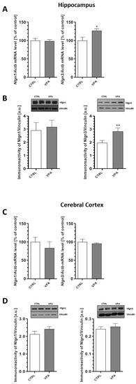 Additionally, we performed qRT-PCR and Western blot analysis of the synaptic cell adhesion molecules known as neuroligins (Nlgns), which are responsible for the connection between two neurons and the formation, maturation, and stabilization of synapses. In our study, the qRT-PCR and Western blot analysis revealed the lack of changes in both the mRNA and protein levels of Nlgn1 in the hippocampus and cerebral cortex of offspring prenatally exposed to VPA (Figure 6A–D). In turn, prenatal exposure to VPA significantly increased the level of neuroligin3 (Nlgn3) by about 45% in the hippocampus (p = 0.0079) (Figure 6B), which was accompanied by an increase in its gene expression (Nlgn3) of about 27% (p = 0.0165) (Figure 6A). Analysis of the expression of Nlgn3 in the cerebral cortex revealed the lack of changes in both the mRNA and protein levels in animals exposed to VPA during embryonic development (Figure 6C,D).