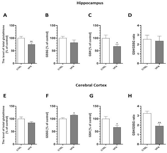 The effect of prenatal exposure to VPA on the glutathione level. The glutathione redox imbalance was determined by spectrophotometric assays. We determined the level of total glutathione, oxidized glutathione (GSSG), reduced glutathione (GSH), and the ratio of GSH/GSSG in the hippocampus ((A–D), respectively), as well as in the cerebral cortex ((E–H), respectively), of the control and VPA-exposed animals. Data represent the mean values ± SEM from n = (10–12) independent experiments in the hippocampus and n = (3–5) in the cerebral cortex. * p < 0.05, ** p < 0.01 vs. control.
