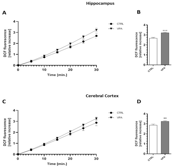The effect of prenatal exposure to VPA on free oxygen radicals (ROS) generation. The level of ROS was determined using a fluorescent probe (H2DCF-DA) on the hippocampus and cerebral cortex of the control and VPA-exposed animals for 30 min ((A,C), respectively) and after 30 min ((B,D), respectively). The results are presented as the relative increase in fluorescence. Data represent the mean values ± SEM from n = 8 independent experiments in both the hippocampus and cerebral cortex. ** p < 0.01, *** p < 0.001 vs. control.