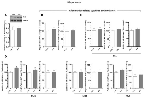 The effect of prenatal exposure to VPA on the status of microglia in the hippocampus. (A) The immunoreactivity of Iba-1 was monitored using a Western blot analysis. Densitometric analysis and representative pictures are shown. Results were normalized to GAPDH levels. Data represent the mean values ± SEM from n = (6–8). independent experiments. The gene expression of Ptgs2, Alox12, (B); Il1b, Il6, and Tnf (C); and the markers of the M2 phenotype’s microglia activation: Arg1, Chi3l1, Mrc1, Cd86, Fcgr1a, Tgfb1, and Sphk1 (D), in the hippocampus of the control and VPA-exposed rats were measured with quantitative RT-PCR and calculated by the ΔΔCt method using Actb (β-actin) as a reference gene. Data represent the mean values ± SEM from n = (4–6) independent experiments. * p < 0.5, ** p < 0.01 vs. control.