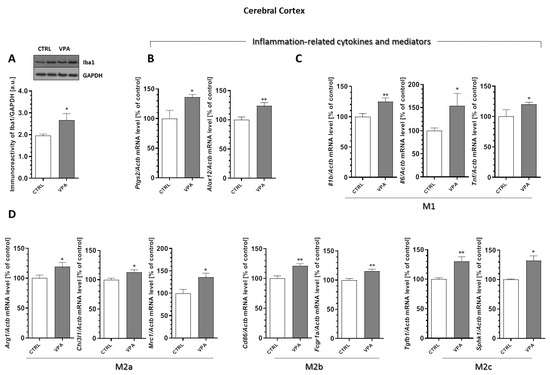 The effect of prenatal exposure to VPA on the status of microglia in the cerebral cortex. (A) The immunoreactivity of Iba-1 was monitored using a Western blot analysis. Densitometric analysis and representative pictures are shown. Results were normalized to GAPDH levels. Data represent the mean values ± SEM from n = (8–11) independent experiments. The gene expression of Ptgs2, Alox12 (B); Il1b, Il6, and Tnf (C); and the markers of the M2 phenotype’s microglia activation: Arg1, Chi3l1, Mrc1, Cd86, Fcgr1α, Tgfb1, and Sphk1 (D) in the cerebral cortex of the control and VPA-exposed rats were measured with quantitative RT-PCR and calculated by the ΔΔCt method with Actb (β-actin) as a reference gene. Data represent the mean values ± SEM for n = (3–6) independent experiments. * p < 0.5, ** p < 0.01 vs. control.