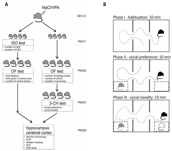 Experimental design. (A) Pregnant Wistar rats were injected at gestation day 12.5 (GD 12.5) with NaCl or VPA (450 mg/kg b.w.). One group of offspring rats (males and females) was subjected to an ISO test at postnatal day 11 (PND 11) and then to an Open-field test (males only) at PND 55. Other groups of offspring rats (males) was subjected to Open-field test at PND 55 and then to a 3-chamber test at PND 57. All offspring rats were euthanized at PND 58; tissue samples from the hippocampus and cerebral cortex were collected and used for biochemical, immunochemical, genetic, and microscopic analysis. (B) Design of the 3-chamber test. A detailed description is included in the behavioural analysis section.