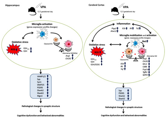 Schematic diagram showing the effect of prenatal exposure to VPA on the pathological changes in brains of young-adult male offspring. A single i.p. injection of VPA at 12.5 days of pregnancy-induced brain structure-specific defects in the expression of key pre- and postsynaptic proteins, consequently leading to pathological alterations in the structure of the synaptic endings (the hippocampus and cerebral cortex). In the hippocampus, the importance of oxidative stress and ROS generation in synaptic pathology is suggested. In the cerebral cortex, in addition to oxidative stress and ROS generation, neuroinflammation associated with microglia mobilization and M1 activation have also been proposed as potential triggers of a molecular cascade leading to synaptopathology. VPA induced long-lasting changes in microglia status in a brain structure-specific manner. In the cerebral cortex, both the pro-inflammatory M1 and the potentially beneficial recovery-promoting M2 phenotype were activated, while in the hippocampus, only M2 was stimulated.