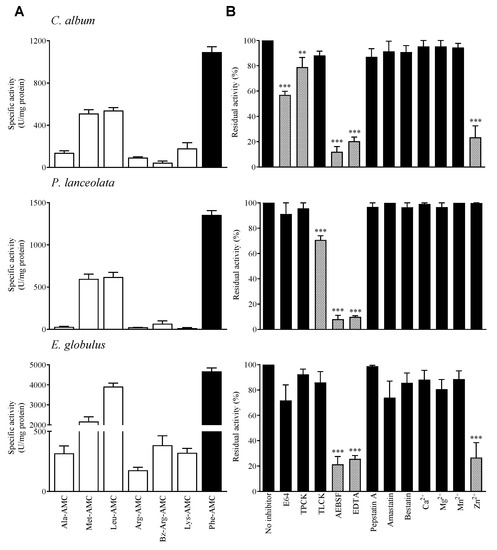 Specificity of pollen proteases from Chenopodium album, Plantago lanceolata and Eucalyptus globulus diffusates. (A) Substrate specificity of pollen proteolytic activity. The extracts were incubated for 20 min at 37 °C with 100 µM peptide-AMC. The black bars indicate the preferred substrate for each pollen diffusate, which was also the substrate used in the inhibition experiments. (B) Effect of class-specific inhibitors on the proteolytic activity of the pollen diffusates. The results represent the percentage of residual activity in comparison to the control condition (without inhibitor). The grey bars indicate statistically significant inhibition results. Dunnett’s post-test: *** p < 0.001; ** p < 0.01(n = 3). 1 unit of activity (U) = pmol AMC released/min/mg of protein.