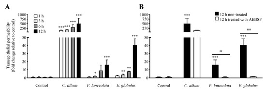 Effect of pollen proteases from Chenopodium album (0.26 ± 0.06 mg/ml), Plantago lanceolata (0.18 ± 0.03 mg/ml) and Eucalyptus globulus (0.75 ± 0.18 mg/ml) on the paracellular permeability of epithelial cells. (A) Time-course effect of pollen diffusates on Calu-3 cells. (B) Effect of untreated pollen diffusates (black bars) and diffusates treated with 1 mM AEBSF (white bars) on the transepithelial permeability of Calu-3 cells. Cells incubated with culture medium were used as a control for this assay. Bonferroni post-test: *** p < 0.001; ** p < 0.01; * p < 0.05 (n = 3) in comparison to the control condition, and ### p < 0.001; ## p < 0.01 (n = 3) for comparisons between treated and untreated conditions.