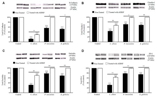 To understand the mechanism that leads to an increase in transepithelial permeability and cell detachment, potential protein targets for disruption [28,35,36] were identified using immunoblot (Figure 3) and immunocytochemistry (Figure SI4). All pollen diffusates caused extensive and significant degradation of E-cadherin, claudin-1, occludin and the cytosolic protein zonula occludens-1 (ZO-1) (Figure 3). C. album had a more drastic effect when compared to P. lanceolata and E. globulus. The protease degradation was inhibited after treatment with AEBSF. Regarding P. lanceolata and E. globulus, there was complete inhibition while only partial inhibition was observed for C. album (Figure 3). These results suggest that the presence of other non-serine proteases was capable of inducing the degradation of intercellular junction proteins.