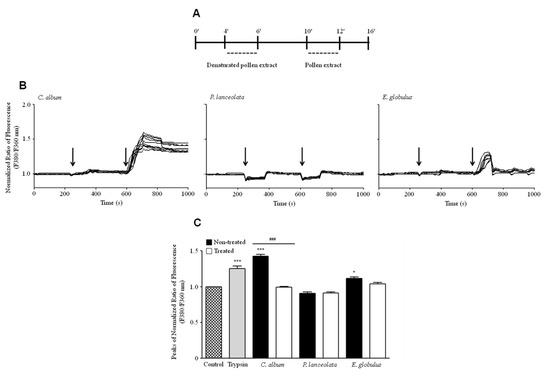 Functional characterization of the effect of pollen proteases from Chenopodium album (0.26 ± 0.06 mg/ml), Plantago lanceolata (0.18 ± 0.03 mg/ml) and Eucalyptus globulus (0.75 ± 0.18 mg/ml) on Calu-3 cells. (A) Calu-3 cultures were incubated for 240 s with Krebs solution and stimulated for 120 s with denatured pollen diffusates followed by 120 s incubation with pollen diffusates. (B) [Ca2+]i variations in Calu-3 cells after exposure to C. album (left graph), P. lanceolata (middle graph) and E. globulus (right graph). Arrows in each panel indicate the time of addition of the pollen diffusate. The fluorescence profiles are representative of 10 cells. (C) The bar graph shows the maximal changes in [Ca2+]i after stimulation with each pollen diffusate. Changes in [Ca2+]i are depicted by the F340/F380 fluorescence ratios of Fura-2-loaded Calu-3 cells. The black bars correspond to each pollen diffusate, while the white bars correspond to denatured pollen diffusates (95 °C for 30 min). The positive control for this assay was a 0.25% trypsin solution. The data are expressed as the mean ±SEM values of at least 30 representative cell traces using Bonferroni’s post-test: *** p < 0.001; * p < 0.05 (n = 4) in comparison to the control condition and for comparisons between treated and untreated conditions ### p < 0.001 (n = 4).