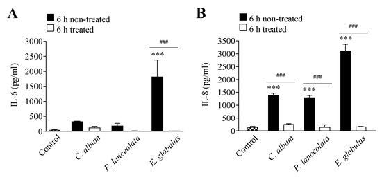 Effect of pollen proteases from Chenopodium album (0.26 ± 0.06 mg/ml), Plantago lanceolata (0.18 ± 0.03 mg/ml) and Eucalyptus globulus (0.75 ± 0.18 mg/ml) on IL-6 (A) and IL-8 (B) release. The black bars correspond to stimulation with each pollen diffusate, while the white bars correspond to the denatured pollen diffusates (95 °C for 30 min). Cells incubated with culture medium were used as the control condition for this assay. The data are expressed as the mean ± SEM values and were analyzed statistically using Bonferroni´s post-test: *** p < 0.001 (n = 3) in comparison to the control condition, and ### p < 0.001 for comparisons between treated and untreated conditions (n = 3).