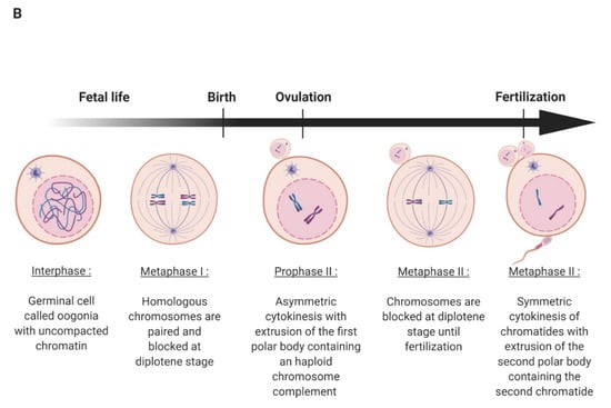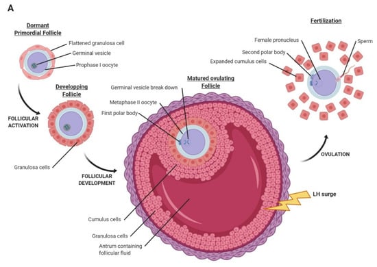 In many mammalian species, the first meiosis of the oocyte is initiated during fetal life and is arrested at the diplotene stage of prophase before birth (Figure 1A,B). Oocyte maturation is defined as the reinitiation and completion of the first meiotic division, subsequent progression to metaphase II, and the nuclear and cytoplasmic processes which become essential for fertilization and early embryo development (Figure 1A,B). During these processes, the oocyte has undergone extensive growth in cellular interaction with the granulosa and theca cells. The oocyte undergoes asymmetric cytokinesis and extrudes the first polar body containing a haploid chromosome complement (Figure 1A,B). The first meiotic division is completed, and the second meiotic division is initiated, but oocytes arrest in metaphase II until contact with a spermatozoon (Figure 1A,B). The initiation of maturation in fully grown oocytes present in antral follicles is based on the mid-cyclic onset of the luteinizing hormone (LH) surge or the external administration of human chorionic gonadotropin (hCG). Mechanisms of oocyte maturation in vivo and in vitro are still under investigation.