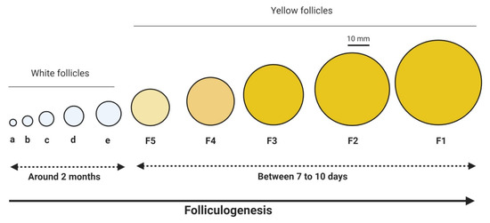 The mature avian ovary contains follicles of different sizes and developmental stages, including primordial follicles, prehierarchical growing follicles (1–4 mm) called white follicles, and large yolk-filled follicles (9–40 mm) recruited to the preovulatory hierarchy [31] (Figure 3). In the primordial follicle, the oocyte contains a large and prominent germinal vesicle (oocyte nucleus). In the yolk-filled follicle, the oocyte contains a large amount of yolk and is surrounded by the perivitelline layer (equivalent to the mammalian ZP) [32]. This perivitelline layer starts to appear between the plasma membrane of the oocyte and the granulosa cell layer during the growth of follicles. The germinal disc containing the oocyte nucleus and cytoplasmic organelles is located at the animal pole. One of the peculiarities of the avian follicle is the presence of 5–7 hierarchical follicles before ovulation. Like the mammalian oocyte, the avian oocyte is arrested in prophase of meiosis I during follicular development. It resumes from meiosis I a few hours before ovulation. However, it is again arrested in metaphase of meiosis II until ovulation. The mature oocyte from the largest yolk-filled follicle (F1, 40 mm) is released into the infundibulum and becomes the ovulated ovum or the egg.